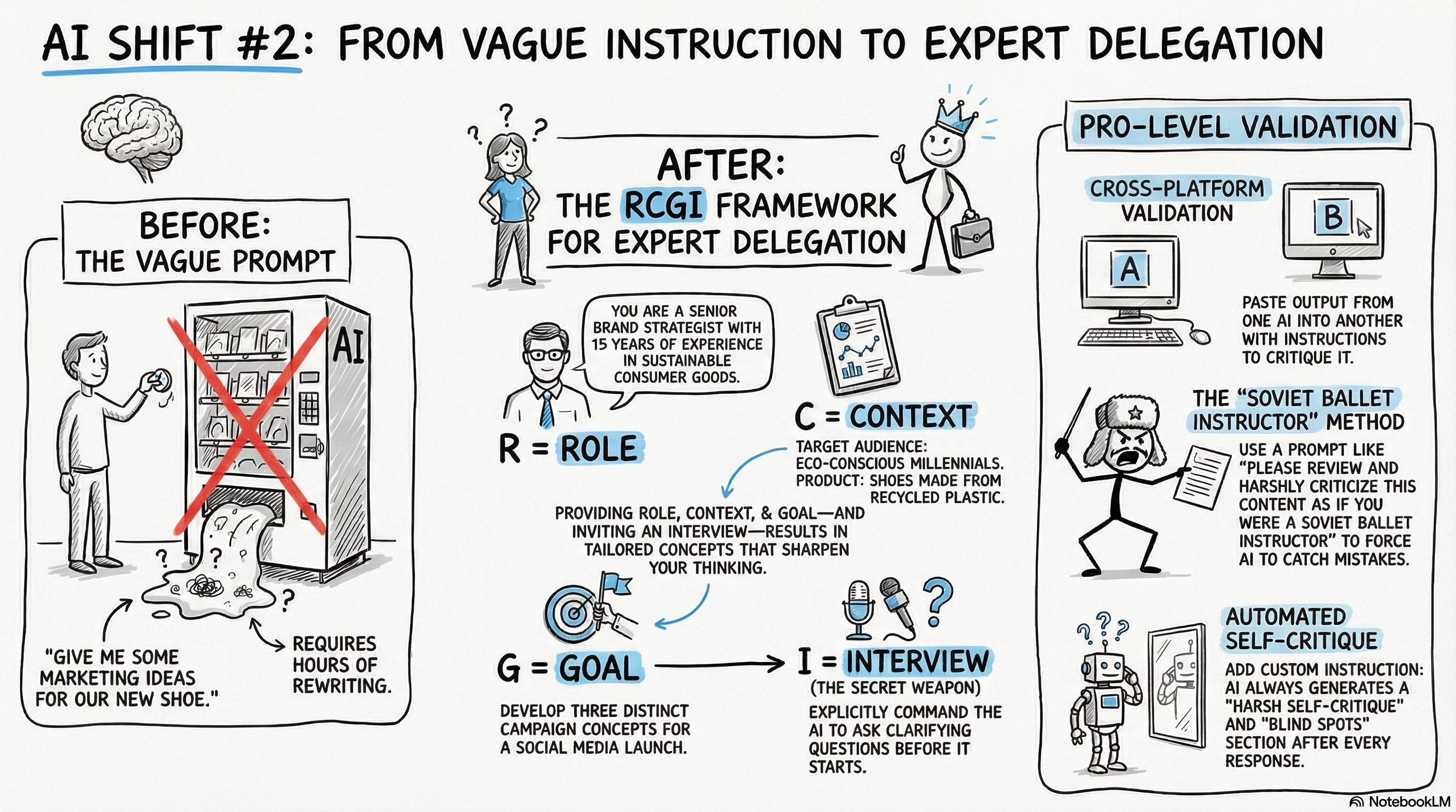 The RCGI framework for delegating to AI the way you would delegate to a senior hire: Role, Context, Goal, Interview.